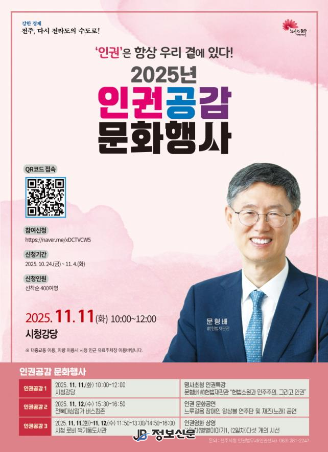 ‘인권은 항상 우리 곁에 있다!’를 주제로 한 이번 행사는 전주시청 강당과 전북대상점가 버스킹존, 시청 로비 책기둥도서관 등에서 진행되며, △인권 특강 △문화공연 △인권영화 상영 △홍보부스 운영 등 시민이 일상에서 인권의 가치를 체감할 수 있는 다양한 프로그램으로 구성된다.