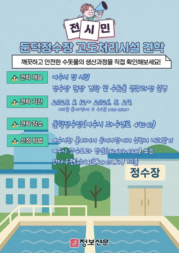운영 기간은 2025년 11월부터 2026년 5월까지로 매월 둘째·넷째 주 수요일 오후 2시부터 3시까지 진행된다. 참여를 희망하는 시민은 여수시 누리집 공지사항에서 신청서를 내려받아 상수도과 (국동청사)에 방문하거나 전자우편(sis94@korea.kr)으로 제출하면 된다.