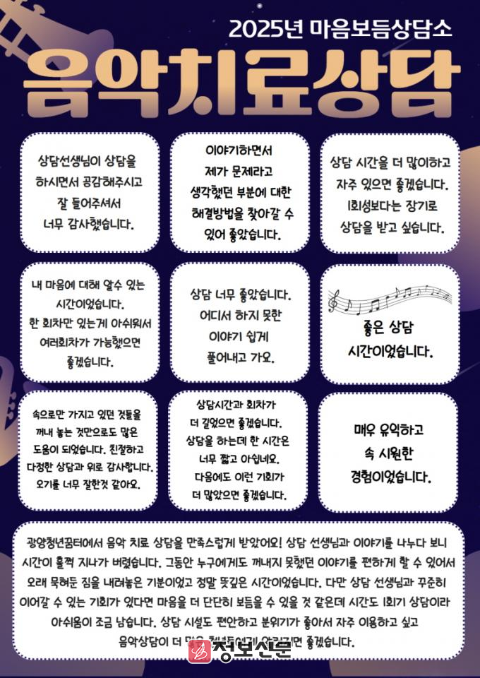 음악치료상담에 참여한 또 다른 청년은 “음악을 통해 감정을 자연스럽게 표현할 수 있었고, 상담사와의 대화를 통해 마음이 한결 가벼워졌다”며 “스스로를 위로할 수 있는 따뜻한 시간이었다”고 전했다.