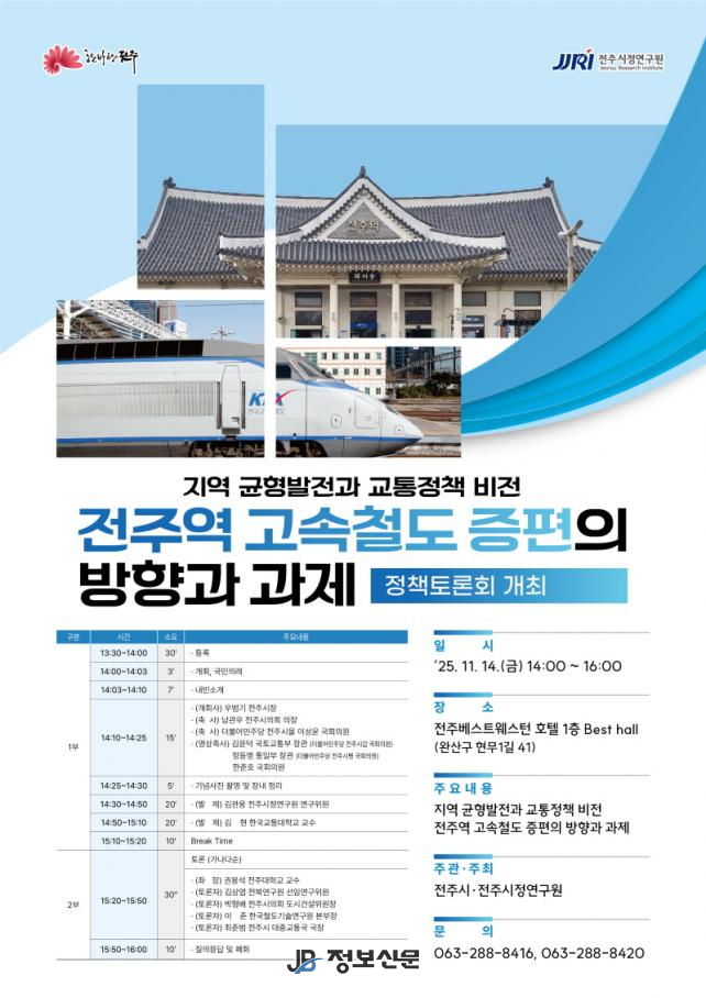 전주시와 전주시정연구원은 오는 11월 14일 오후 2시, 베스트웨스턴플러스 전주호텔 1층 베스트홀(완산구 현무1길 41)에서 ‘지역 균형발전과 교통정책 비전-전주역 고속철도 증편 방향과 과제’를 주제로 정책토론회를 개최한다.