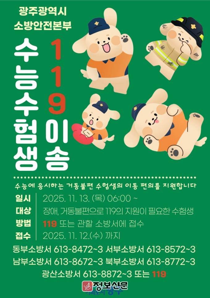![]() 광주시소방안전본부, 수능날 거동 불편 수험생 ‘119 이송’서비스 진행 |