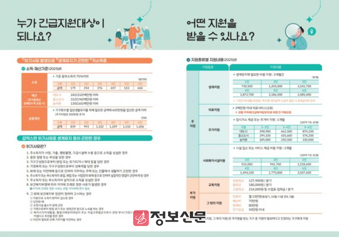 긴급복지 지원은 주 소득자의 실직, 사망, 중한 질병․부상, 화재, 휴․폐업 등 위기 상황 발생으로 생계유지가 곤란한 저소득 가구에 생계비, 의료비, 주거비, 복지시설 이용, 교육비, 해산비 등을 지원하는 제도로 거주지 관할 읍․면사무소나 입원 치료 중인 의료기관을 통해 신청할 수 있다.