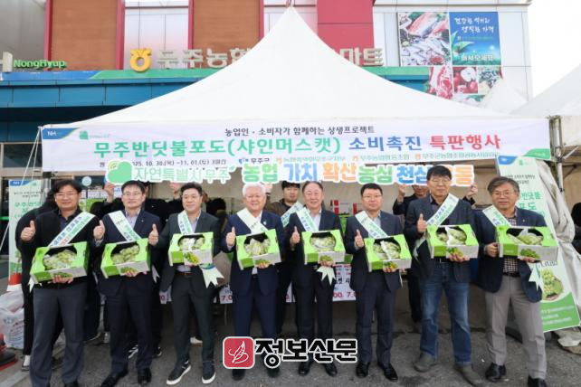 행사 첫날인 30일에는 황인홍 무주군수와 오광석 무주군의회 의장, 곽동열 무주농협장, 양시춘 무주군농협조합공동사업법인 대표, 김범석 농협중앙회 무주군지부장 등 20여 명이 함께 무주 반딧불 샤인머스캣의 우수성을 알리며 소비 촉진에 나서 의미를 더했다.