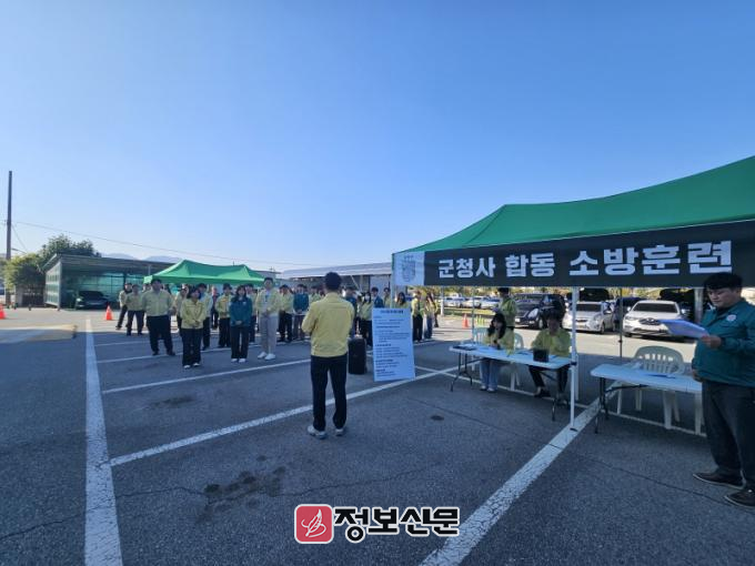 훈련에는 이정국 부군수를 비롯해 공직자 100여 명과 소방관 10명이 참여했으며, 청사 내 화재 발생을 가정한 실제 대응훈련이 이뤄졌다.
