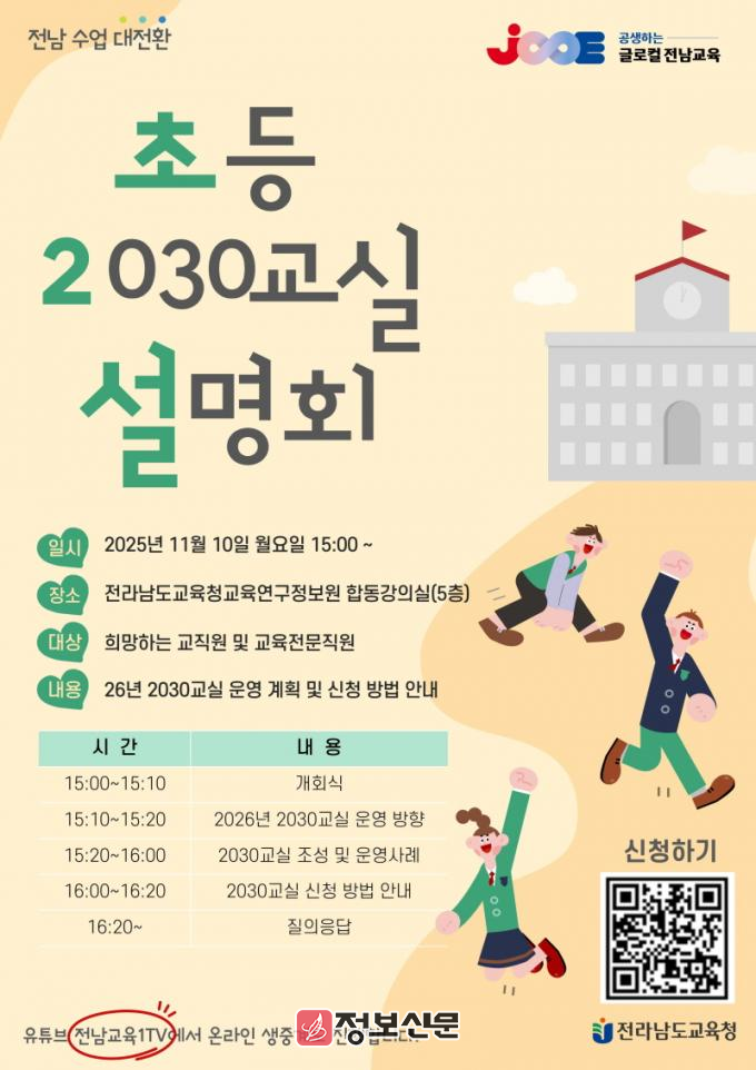 이와 관련해 전남교육청은 오는 10일 오후 3시 전라남도교육청교육연구정보원에서 ‘초등 2030교실 설명회’를 열어 2026학년도 2030교실 운영 계획과 신청 방법을 안내한다. 설명회는 운영 방향 안내와 사례 나눔, 신청 절차 및 질의응답 순으로 진행되며, 관심 있는 교직원은 공문 및 포스터 QR코드를 통해 참여할 수 있다. 당일 행사는 유튜브 ‘전남교육1TV’를 통해 실시간 중계된다.