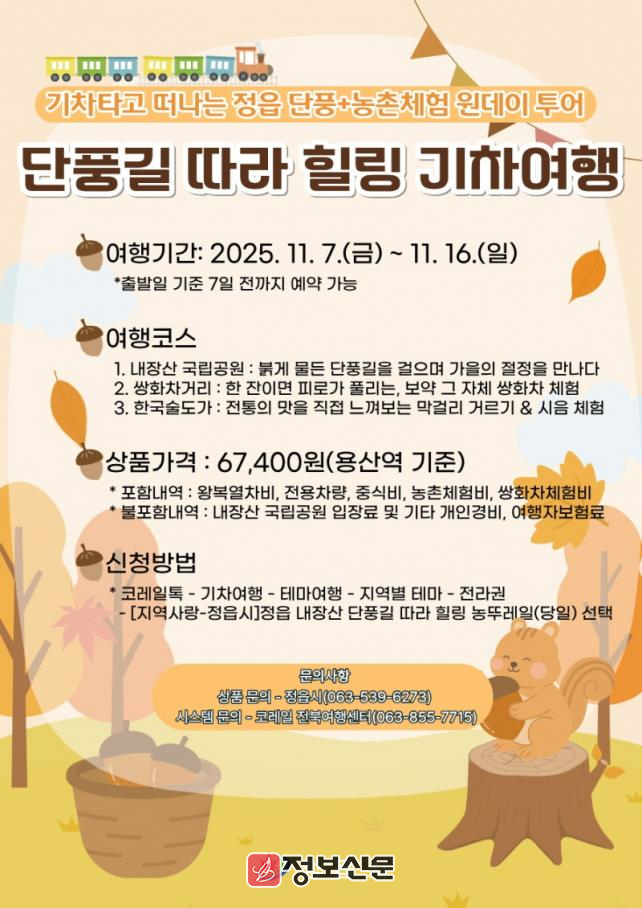 ![]() 정읍시, ‘내장산 단풍+농촌체험’ 농뚜레일 기차여행 11월 7일 개시 |