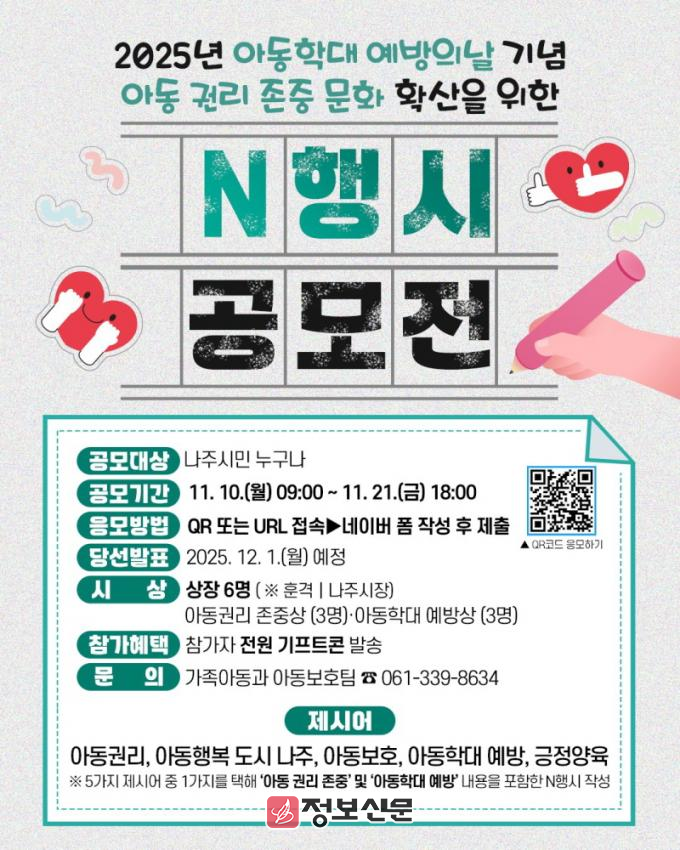 ![]() 나주시, 제4회 아동 권리 존중 ‘N행시 공모전’ 개최 |