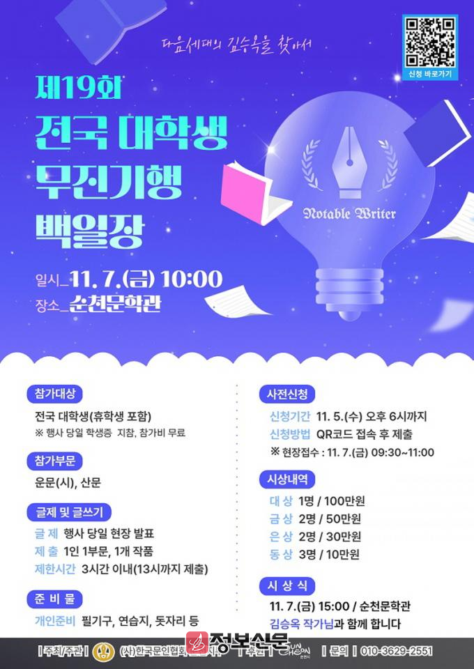 ![]() 순천문인협회, 제19회 전국대학생 무진기행 백일장 개최 |