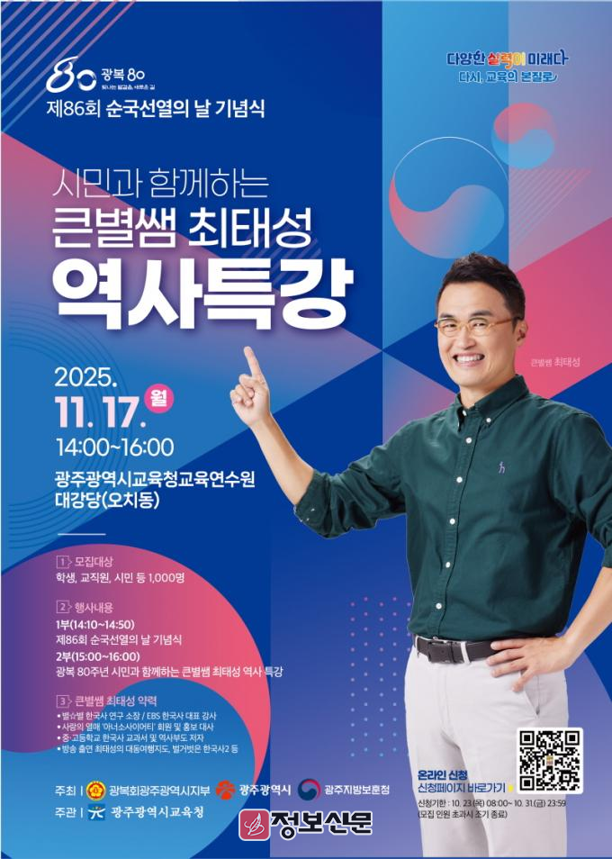 최 강사는 ‘근현대사의 과정 및 원인, 앞으로 가야할 길’을 주제로 한국 근현대사의 주요 사건을 설명할 예정이다. 강연 참여를 희망하는 초·중·고 학생, 교직원, 학부모 등은 온라인(https://naver.me/GLzCfbsQ) 또는 큐알(QR)코드로 신청하면 된다. 단, 모집인원 1천명이 넘으면 신청은 자동 종료된다.