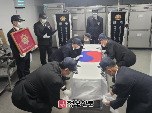 이날 오전 제주시 소재 장례식장에서 무공수훈자회 선양단 주관으로 관포식이 진행됐다. 양지공원에서 국립제주호국원까지 운구는 제주경찰청의 에스코트 지원 속에 엄숙하게 이뤄졌다.