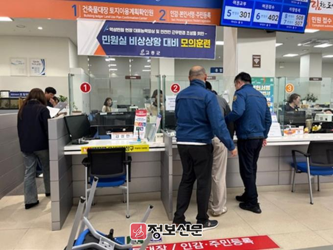 군 종합민원실 관계자는 “이번 훈련은 돌발상황에 대한 대응능력 향상뿐만 아니라, 민원인의 편의와 신뢰를 높이는 안전한 민원실 운영 체계 확립이 목적”이라며 “앞으로도 민원서비스 품질 향상과 상호 존중의 민원문화 정착을 위해 노력하겠다”고 말했다.