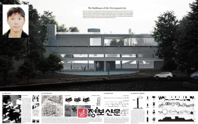 김현준 학생의 작품‘The Bathhouse of the Overexposure City’는 서울 강남구 학동근린공원 내 도심형 공공목욕탕을 제안한 설계로, 현대 도시 속에서 ‘머무름’과 ‘느림’의 건축적 가치를 구현했다. 그는 메를로퐁티의 현상학적 철학을 바탕으로, 사용자가 공간을 거닐며 자신의 속도와 감각을 조율하는 의례적 공간을 창조했다는 점에서 높은 평가를 받았다.