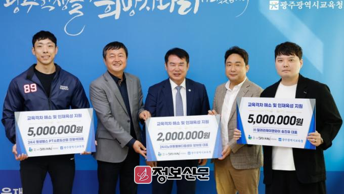 이번 기부금은 ㈜달려라 제이앤와이와 24시 평생헬스PT 소촌도산점 각 500만원, 24시 노아동물메디컬센터 200만원 등 3곳에서 광주 교육발전을 위해 마련했다.