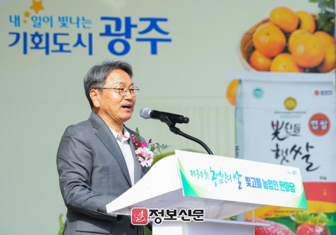 '농업에서 미래를! 농민에게 희망을!’을 주제로 열린 이날 행사는 광주시가 주최하고 농업인단체연합회가 주관했다. 강기정 시장을 비롯해 농업인·시민 1000여 명이 참석해 화합의 장을 이뤘다.
