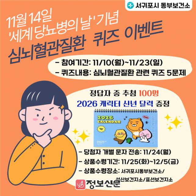 ![]() 서귀포시 동부보건소, ‘워크온’ 심뇌혈관질환 퀴즈 이벤트 운영 |