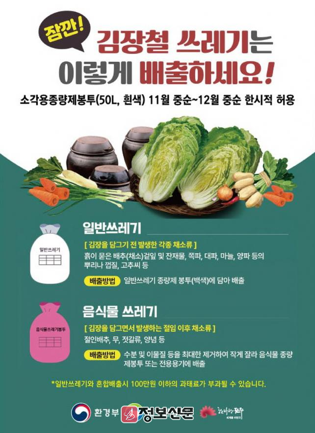 각 가정에서는 김장쓰레기가 많이 발생해 음식물 수거용기가 부족한 경우에는 음식물쓰레기 전용봉투(20L, 분홍색)를 사용하거나, 일반쓰레기 소각용 봉투(50L, 흰색)에 담아 배출하면 된다. 단, 음식물쓰레기와 일반쓰레기를 혼합 배출할 경우에는 최대 100만 원 이하의 과태료가 부과될 수 있어 주의해야 한다.