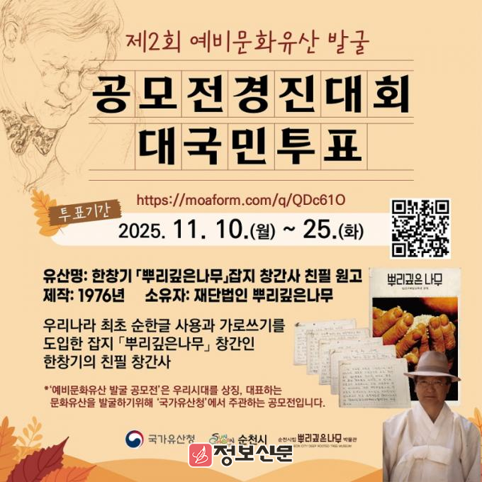 ![]() 순천시, 「뿌리깊은나무」 한창기 친필 원고 예비문화유산 공모전 최종후보 선정 |