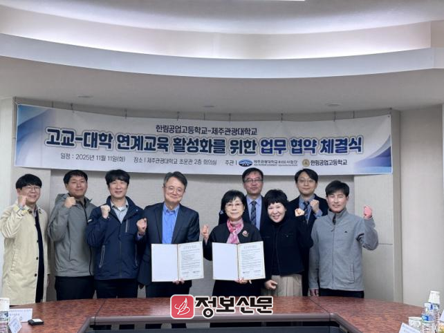 제주관광대학교(총장 김성규)와 한림공업고등학교(교장 이진승)는 11월11일 제주관광대학교 초운관에서 대학-고교 연계교육 활성화를 위한 업무 협약을 체결했다.