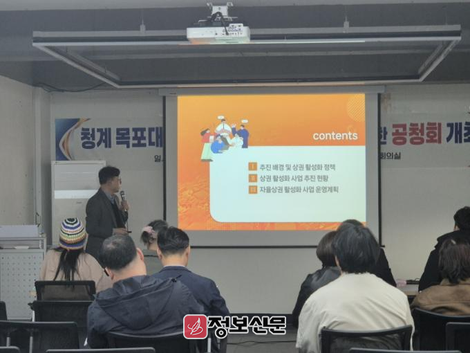 이날 공청회에서는 목포대학교 경영대학 경영학부 이석인 교수의 「청계면 자율상권 활성화 사업 운영계획 소개」라는 주제로 ▲사업추진 배경 및 상권활성화 정책, ▲목대 후문 상권활성화 추진 현황 ▲목대 후문 자율상권 활성화 사업 운영계획을 설명하고, 질의응답의 시간을 가졌다.