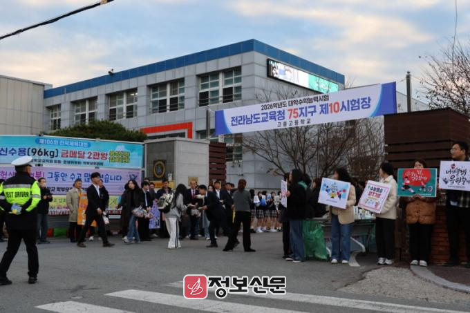 현장에는 고흥군의회, 고흥교육지원청, 고흥경찰서 등 지역 기관단체 관계자들도 함께해 수험생들을 격려했으며, 고흥군학부모연합회 회원들은 따뜻한 차를 나눠주며 수험생들의 긴장을 풀어주는 등 훈훈한 분위기를 더했다.