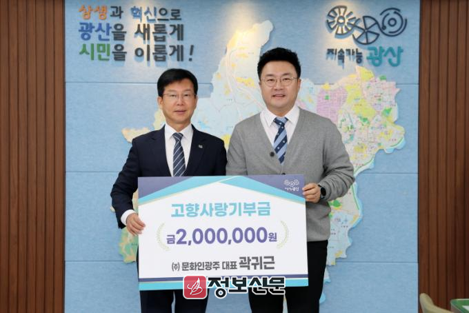 ![]() 곽귀군 ㈜문화인광주 대표(오른쪽)가 13일 광산구 고향사랑기부금 200만 원을 기탁했다.