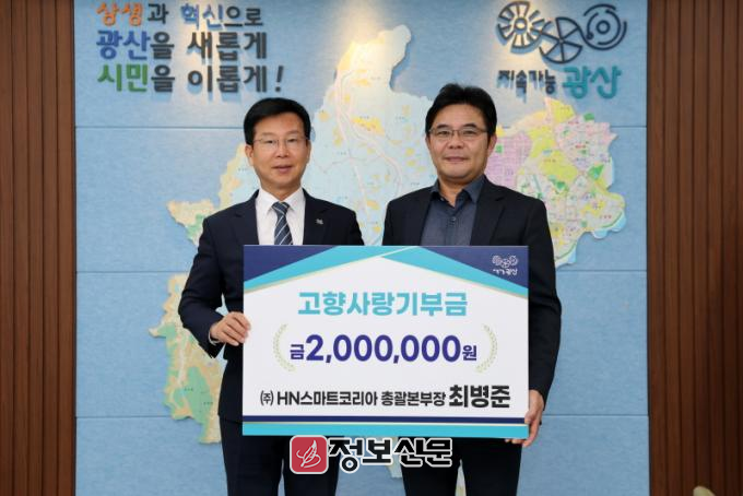 ![]() 최병준 ㈜에이치엔스마트코리아 총괄본부장(오른쪽)이 13일 광산구 고향사랑기부금 200만 원을 기탁했다. |