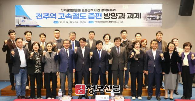 전주시와 전주시정연구원은 14일 베스트웨스턴플러스 전주호텔 베스트홀에서 우범기 전주시장과 남관우 전주시의회 의장, 이성윤 국회의원(더불어민주당, 전주시을), 교통·철도 분야 전문가와 학계, 관계기관, 시민 등 100여 명이 참석한 가운데 ‘지역 균형발전과 교통정책 비전–전주역 고속철도 증편 방향과 과제’ 정책토론회를 개최했다.