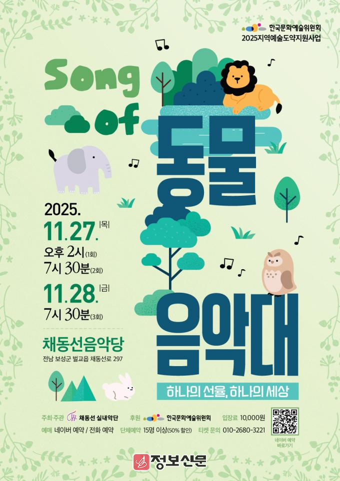 김정호 예술감독은 “연주자들이 음악으로 말하고, 관객이 마음으로 듣는 경험이 『Song of 동물음악대』가 전하고자 하는 예술의 진심”이라며 “이번 공연이 지역에서 세계로 확장되는 평화와 생명의 노래가 되길 바란다.”라고 전했다.