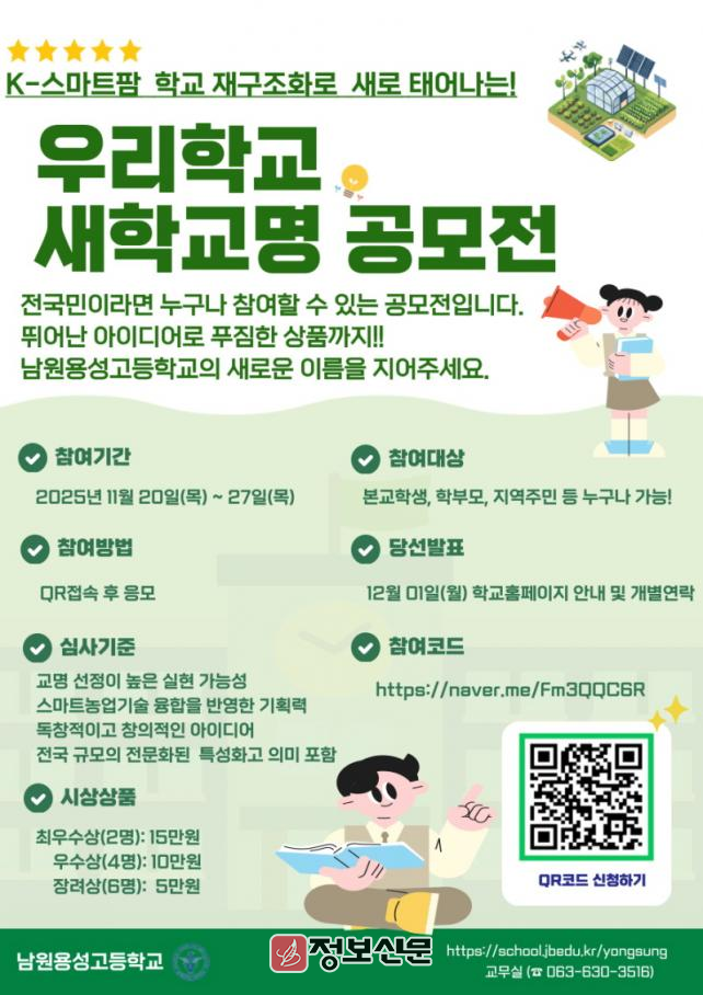 ![]() 남원용성고등학교, 우리학교 새학교명 공모전 추진 |