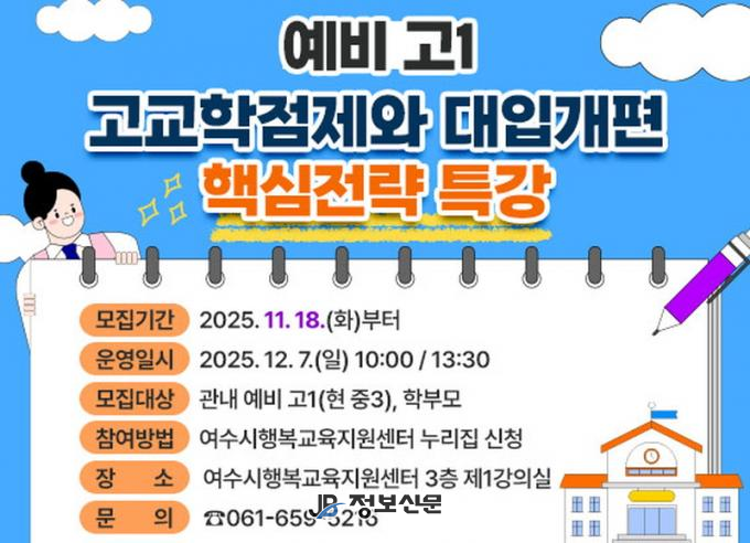 ![]() 여수시, 예비 고1 대상 ‘고교학점제·대입 개편’ 핵심 전략 특강 개최 |