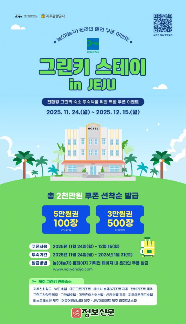 이번 이벤트는 그린키 인증 숙소의 홍보 강화와 더불어 제주를 찾는 여행객들이 보다 쉽게 친환경 숙소를 이용할 수 있도록 편의를 제공하기 위해 추진하는 가운데 도와 공사는 국내 대표 OTA(온라인 여행사) 플랫폼인 ‘놀(www.nol.yanolja.com)’을 통해 총 2,000만원 규모의 숙박 할인 쿠폰을 선착순으로 제공하는 ‘그린키 스테이 in JEJU’ 기획전을 진행할 예정이다. 할인 대상은 제주지역 그린키 인증 숙소로 한정되며, 투숙 가능 기간은 2026년 1월 31일까지다.