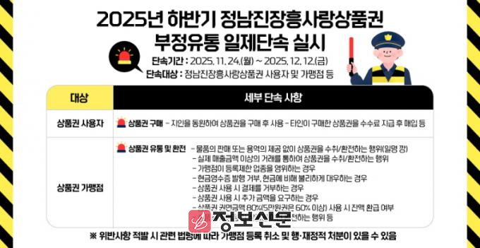 이번 단속은 지역사랑상품권의 부정유통을 사전에 차단하고 건전한 유통질서 확립을 위해 추진된다.