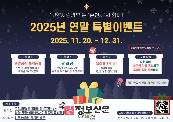 ![]() 순천시, 연말정산 시즌 맞아 ‘고향사랑기부제 특별이벤트’ 실시 |