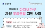 전북 남재옥 기자2026. 03.16[정보신문 = 남재옥 기자] 군산시가 3자녀 이상 다자녀 가구의 이동 편의를 돕고 가족 단위 여가 활동을 장려하기 위해 '3자녀 이상 다자녀 가구 차량 무료 렌탈 지원 사업'을 17일부터 본격 시행한다고 밝혔다. 이번 사업은 아이 키우기 좋은 환경을 조성하기 위한 군산시 인구 정책의 일환으로, 군산을 응원하는 마음이 모인 고향사랑기부제 지정기부금으로 추진되어 그 의미를 더했다. 시는 이를 통해 다자녀 가구의 경제적 부담을 덜고, 가족과 함께하는 소중한 시간을 지원하고자 한다. 지원 대상은 공고일 기준 ▲부 또는 모와 세 ...