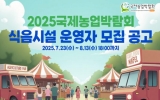 전남 김금덕 기자2025. 08.04[정보신문 = 김금덕 기자] (재)전라남도국제농업박람회는 2025 국제농업박람회 식음시설 운영자를 오는 13일까지 3주간 모집한다고 밝혔다. 이번 모집은 주제전시관인 농업미래관 옆 뷔페관(288석·600㎡)과 행사장 내 푸드트럭을 대상으로 진행한다. 전남·광주지역 주소를 두고 해당 업종을 정상적으로 운영 중인 업체면 신청할 수 있다. 자세한 내용은 국제농업박람회 누리집의 공고문에서 확인할 수 있으며, 궁금한 사항은 국제농업박람회 행사운영팀(061-330-9221)으로 문의하면 된다. 박관수 전남도국제농업박람회 사무국...