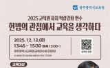정치 남재옥 기자2025. 12.02[정보신문 = 남재옥 기자] 광주시교육청(교육감 이정선)은 오는 12일 오후 1시45분부터 광주시교육청교육연수원 대강당에서 문형배 전 헌법재판관을 초빙해 ‘교직원 자치 역량 강화 연수’를 개최한다. 이번 연수는 시교육청의 ‘헌법과 민주주의 수호 기간’을 맞아 헌법적 가치에 기반한 민주적 학교 자치 실현을 위해 마련됐다. 문 전 재판관은 ‘헌법의 관점에서 교육을 생각하다’라는 주제로 민주적 교육 현장에서 요구되는 자율성·책임성·민주성의 의미를 소개할 예정이다. 광주광역시교육청은 이날 연수에 앞서 헌법 수호의 의미를...