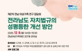 전남 남재옥 기자2025. 12.01[정보신문 = 남재옥 기자] 전남여성가족재단은 제2차 전남 여성가족 연구 집담회 「전라남도 자치법규의 성평등한 개선 방안」을 12월 8일(월) 오후 2시에 전남여성가족재단 207호 강의실에서 개최한다. 이번 집담회는 전라남도양성평등기금을 재원으로 수행된 『전라남도 자치법규 특정성별영향평가』 연구의 일환이며, 전라남도 본청 조례 576건을 성평등 관점에서 점검한 결과를 공유하고 성평등한 조례 제․개정을 확산하기 위한 방안을 모색하기 위해 마련되었다. 토론회에서는 전남여성가족재단 위라겸 연구위원이 「전라남도 자치...
