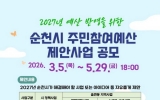 [정보신문 = 남재옥 기자] 순천시는 2027년도 예산편성 과정에 시민의 다양한 의견과 아이디어를 반영하기 위해 3월부터 5월까지 주민참여예산 제안사업을 접수한다고 밝혔다. 주민참여예산제는 시민이 직접 지역에 필요한 사업을 제안하고, 이를 예산에 반영함으로써 재정 운영의 투명성과 민주성을 높이는 제도이다. 시민의 시각에서 생활 속 불편사항을 발굴하고, 지역 현안 해결을 위한 정책을 제안할 수 있다는 점에서 실질적인 참여 행정의 대표제도로 자리매김하고 있다. 순천시는 2021년부터 24개 읍면동 주민자치회를 전면 시행해 왔...