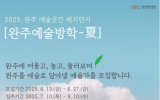 완주 김금덕 기자2025. 06.16[정보신문 = 김금덕 기자] (재)완주문화재단(이사장 유희태)은 지역 예술 활성화를 위한 레지던시 프로그램 2025 [완주예술방학-夏]의 참가 예술인을 모집한다. 이 사업은 완주예술곳간을 거점으로 운영되며, 예술인에게 창작 공간과 숙소, 지원금을 제공하고, 지역 자원을 활용한 프로젝트를 통해 주민과의 소통하는 것을 목표로 한다. [완주예술방학-夏] 레지던시는 작업형과 거주형으로 구분되며, 완주군 내 예술가는 작업형(예술곳간 2동), 외부 예술가는 거주형(예술곳간 3동)에 신청할 수 있다. 시각예술, 설치미술, 퍼포먼스 등 다양...