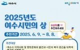 여수 김금덕 기자2025. 06.09[정보신문 = 김금덕 기자] 여수시(시장 정기명)는 오는 8월 8일까지 ‘여수시민의 상’과 ‘자랑스런 여수인’ 후보자 추천을 받는다고 9일 밝혔다. ‘여수시민의 상’은 지역사회와 향토 문화 발전에 이바지하고 시민 복지증진에 현저히 공헌하거나 탁월한 재능으로 시민의 명예를 국내외에 선양한 사람에게 주어지는 상이다. 추천 부문은 ▲지역개발 ▲산업경제 ▲교육과학 ▲문예홍보 ▲사회복지 ▲체육진흥 ▲향토방위 등 7개이다. 후보자는 시장, 시의회의장, 유관기관 단체장, 대학장 및 각급 학교장이 추천할 수 있으며, 주민 50인 ...