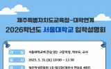 교육 김금덕 기자2025. 05.20[정보신문 = 김금덕 기자] 제주특별자치도교육청(교육감 김광수)은 오는 31일 도내 고등학생과 보호자를 대상으로 맞춤형 진학 정보를 제공하기 위해 ‘2026학년도 서울대학교 입학설명회’를 제주학생문화원 1층 대극장에서 개최한다. 이번 설명회는 도교육청이 추진하는 ‘대학 연계 대입설명회’의 하나로 마련되었으며 서울대학교 입학사정관이 직접 2026학년도 입학전형 및 학생부종합전형 준비 방법에 대해 상세히 안내할 예정이다. 서울대학교 진학을 희망하는 도내 고등학생, 보호자, 교사는 제주진로진학지원센터 누리집(https://ji...