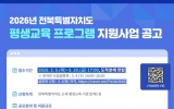 전북 남재옥 기자2026. 02.26[정보신문 = 남재옥 기자] 전북특별자치도평생교육장학진흥원(원장 이현웅)은 도민의 지속적인 성장과 삶의 질 향상을 위해 「2026년 전북특별자치도 평생교육 프로그램 지원사업」공모를 실시하고, 참여할 도내 평생교육 기관·단체를 모집한다. 이번 사업은 아동·청소년, 청년·중장년, 노년 등 생애주기별 특성을 반영한 맞춤형 평생교육과 함께 취약계층 및 경계선지능인을 포함한 보편적 평생교육을 지원하는데 중점을 두고 있다. 이를 통해 교육격차를 완화하고, 도민 누구나 학습에 참여할 수 있는 기반을 강화할 계획이다. 공모분야는 총 ...