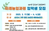 순천 김금덕 기자2025. 03.31[정보신문 = 김금덕 기자] 순천시(시장 노관규)는 오는 4월 4일까지 2025년 농업인대학 미래농업과정 입학생을 모집한다고 밝혔다. 2025년 순천시 농업인대학 미래농업과정은 4월 24일 입학식을 시작으로 10월 30일까지 스마트농업 기술교육 및 아열대 재배기술 교육을 21회(83시간) 실시한다. 올해는 국립순천대학교와 협의하여 농업과학교육원 스마트팜 실습교육장에서 파종, 육묘, 착과량 조절, 수확 등 스마트팜 실습교육을 통해 실질적인 미래농업기술을 배울 수 있는 기회를 제공할 계획이다...