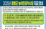 함평 김금덕 기자2025. 03.16[정보신문 = 김금덕 기자] 함평군이 지역 농어민의 농업 활동을 장려하기 위해 농가당 60만원 상당의 농어민 공익수당 지급을 시작했다. 함평군은 16일 “농어민 공익수당 중점 지급이 지난 14일부터 시작되었으며 28일까지 대상 농어민들은 관할 지역농협에서 수령할 수 있다”고 밝혔다. 앞서, 함평군은 1월 16일부터 2월 7일까지 농어민 공익수당 신청을 받았으며 3월 7일 심의 위원회 거쳐 총 8,199명 중 적격자 7,801명을 지급대상자로 선정했다. 이번 농어민 공익수당은 신분증을 지참해 본인이 직접 수령해야 한다...