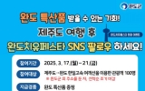 완도 김금덕 기자2025. 03.13[정보신문 = 김금덕 기자] 완도군은 3월 17일부터 21일까지 5일간 제주도에서 완도로 이동하는 관광객을 대상으로 ‘완도 치유 페스타 현장 이벤트’를 진행한다. 이벤트는 관광객들에게 특산품을 제공함으로써 완도·특산품 홍보 및 관광 활성화를 도모하고자 마련됐다. 이벤트 대상은 제주도에서 완도로 향하는 한일고속 여객선을 이용한 관광객으로 완도군 외 타 지역에 주소를 두고 있어야 한다. 특산품은 선착순 100명에게 증정할 계획이다. 참여 방법은 ‘완도 치유 페스타’ 공식 SNS(인스타그램, 페이스북, 블로그)를 팔로우한 후...