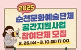 광양 김금덕 기자2025. 02.26[정보신문 = 김금덕 기자] (재)순천문화재단(이사장 노관규)이 오늘 26일부터 다음 달 10일까지 ‘2025 순천문화예술단체 공간지원사업’ 참여 단체를 공개 모집한다고 밝혔다. ‘순천문화예술단체 공간지원사업(이하 공간지원사업)’은 순천 문화예술단체들의 안정적인 활동 거점을 확보하고 창작 활성화를 위한 지원 사업이다. 올해 공간지원사업은 다양한 문화예술 분야에서 활동 중인 총 18여 개의 단체를 선발할 예정이며, 신청 대상은 순천시 소재 7명 이상의 문화예술단체로 예술 활동을 위한 창작공간을 월세로 임대하고 있는 경우이다...