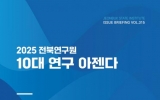 전북 김금덕 기자2025. 02.12[정보신문 = 김금덕 기자] 전북자치도 백년대계를 설계하는 씽크탱크 전북연구원(원장 이남호)이 민선 8기 비전과 목표 달성을 뒷받침할 2025년 10대 연구 아젠다를 선정했다. 전북연구원은 12일 이슈브리핑(315호)을 통해 ‘함께 혁신, 함께 성공, 새로운 전북’의 비전과 ▲도민경제 부흥 ▲농생명산업 수도 ▲문화·체육·관광거점 조성 ▲새만금도약·균형발전 ▲도민행복·희망교육 등 도정 5대 목표를 뒷받침하기 위해 연구원 역량을 집중하기 위한 10대 연구아젠다를 선정했다고 발표했다. 10대 연구 아젠다는 △백년대계 미래산업 ...