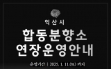 전북 김금덕 기자2025. 01.04[정보신문 = 김금덕 기자] 익산시가 국가 애도 기간 이후에도 '항공 참사 합동분향소'를 운영한다. 익산시는 시청 1층에 마련된 '항공 참사 합동분향소'를 오는 11일 오후 6시까지 일주일 연장 운영하기로 했다고 4일 밝혔다. 합동분향소 운영시간은 오전 9시부터 오후 6시까지만, 이 시간 외에도 시민 누구나 자율적으로 조문할 수 있다. 지난달 31일 운영을 시작한 익산시 합동분향소에는 지금까지 시민 1,000여 명의 발길이 닿았다. 특히 새해를 맞는 1일 가족 단위 시민들이 분향소를 찾아 이웃의 아픔에 함께했다. ...