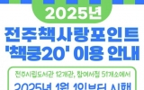 전주 김금덕 기자2024. 12.30[정보신문 = 김금덕 기자] 전주시는 시민들이 도서를 구입할 때 정가의 20%를 할인받을 수 있는 전주책사랑포인트 ‘책쿵20’ 서비스가 2025년 새해 첫날부터 재개된다고 30일 밝혔다. ‘책쿵20’은 전주시에 주소를 둔 전주시립도서관 회원이라면 서비스 가입 후 참여서점에서 도서 구매 시 정가의 20%를 포인트(원)로 지급 받고, 즉시 사용해 책값을 할인받을 수 있는 제도다. 참여서점에서는 참고서, 문제집, 잡지, 전집 등 일부 도서를 제외한 도서 구매 시 정가의 20%를 할인받을 수 있으며, 1인 월 최대 3만 포인트(...