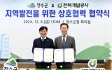사회 김금덕 기자2024. 12.06[정보신문 = 김금덕 기자] 장수군은 6일 군청 2층 회의실에서 전북개발공사와 상호 신뢰를 바탕으로 군의 미래발전과 동반성장을 위한 상호협력 관계를 구축하고자 ‘지역발전을 위한 협약’을 체결했다. 이날 협약식은 최훈식 군수와 최정호 전북개발공사 사장 등 양 기관의 관계자들이 참석한 가운데 진행되었으며 군과 전북개발공사가 손을 맞잡고 지역발전의 새로운 길을 열어가는데 뜻을 함께했다. 특히, 이번 협약은 침체된 도시에 새로운 활력을 불어 넣어 지방소멸 위기를 극복하고 지역개발사업을 성공적으로 추진해 장수군의 지속가능한 발전...